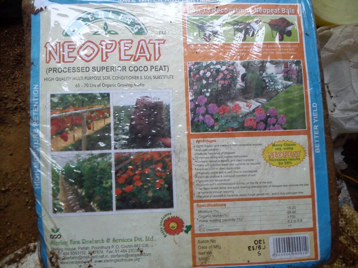 സ്റെര്ലിംഗ് കമ്പനി ഇറക്കുന്ന കൊക്കോപീറ്റ് ന്റെ പേര് നിയോപീറ്റ് എന്നാണ്. അര കിലോ , അഞ്ചു കിലോ അളവുകളില് ഇവ ലഭ്യം ആണ്. അഞ്ചു കിലോയുടെ വില 130 രൂപ ആണ്. മണ്ണിനു പകരം ആയി അല്ലെങ്കില് മണ്ണും കൂടി ചേര്ത്ത് ഇവ കൃഷി ചെയ്യാന് ഗ്രോ ബാഗുകളില് നിറയ്ക്കാം.